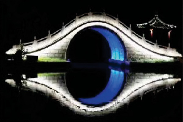 3. 建筑與雕塑照明。 對亭臺樓閣、雕塑等構筑物進行照明時,不應影響其本身的形態(tài)、色彩及材質,而應從其特征出發(fā),采用側面自上而下投光的方式,造成神態(tài)真實、立體感強的照明效果,不宜從正面均勻照射。